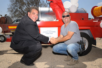 | JNF CEO Russell Robinson and a fire wagon purchased with Jewish National Fund donations. |